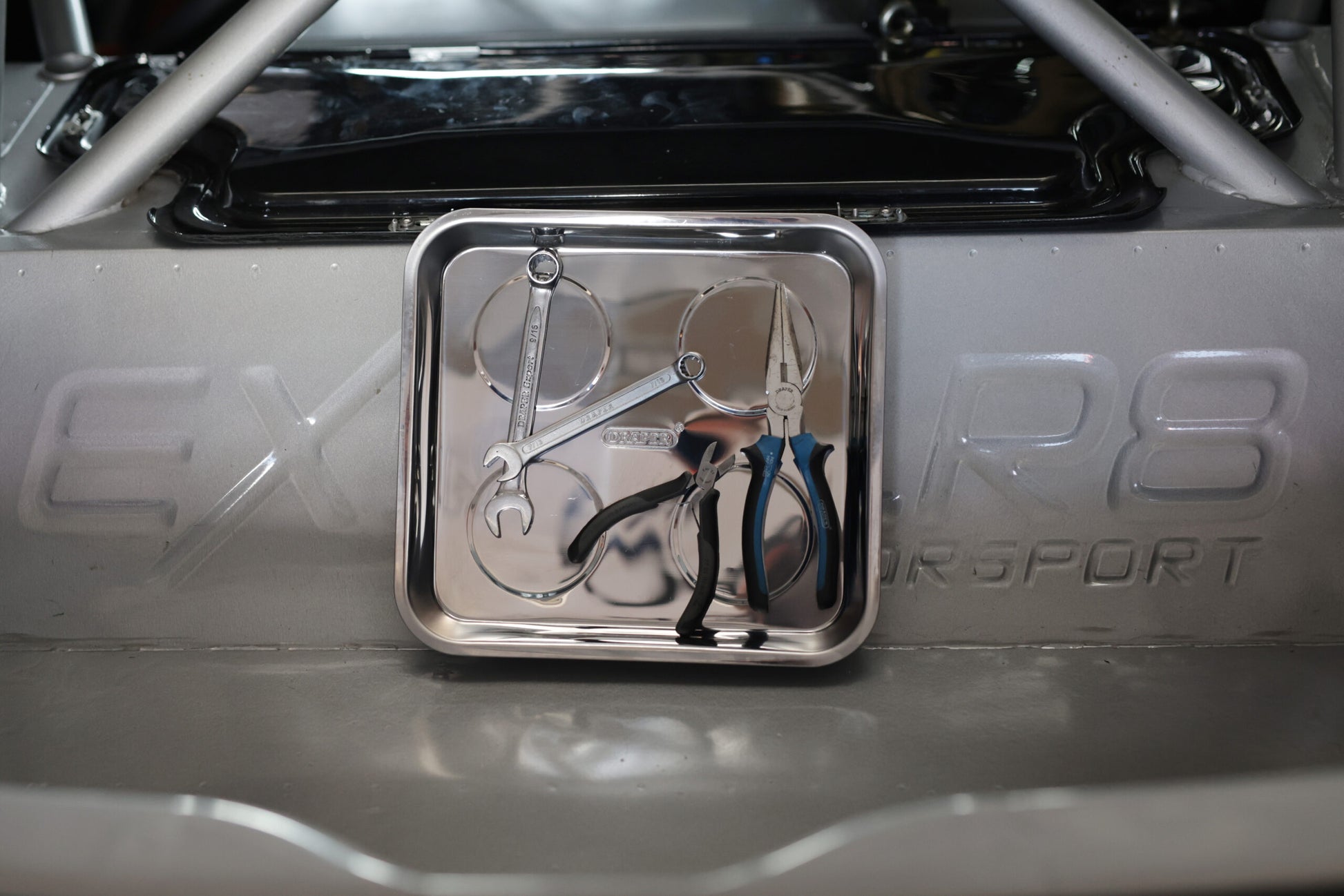 Stainless steel, magnetic parts tray. Manufactured from high grade steel and fitted with 4 strong magnets on the base.