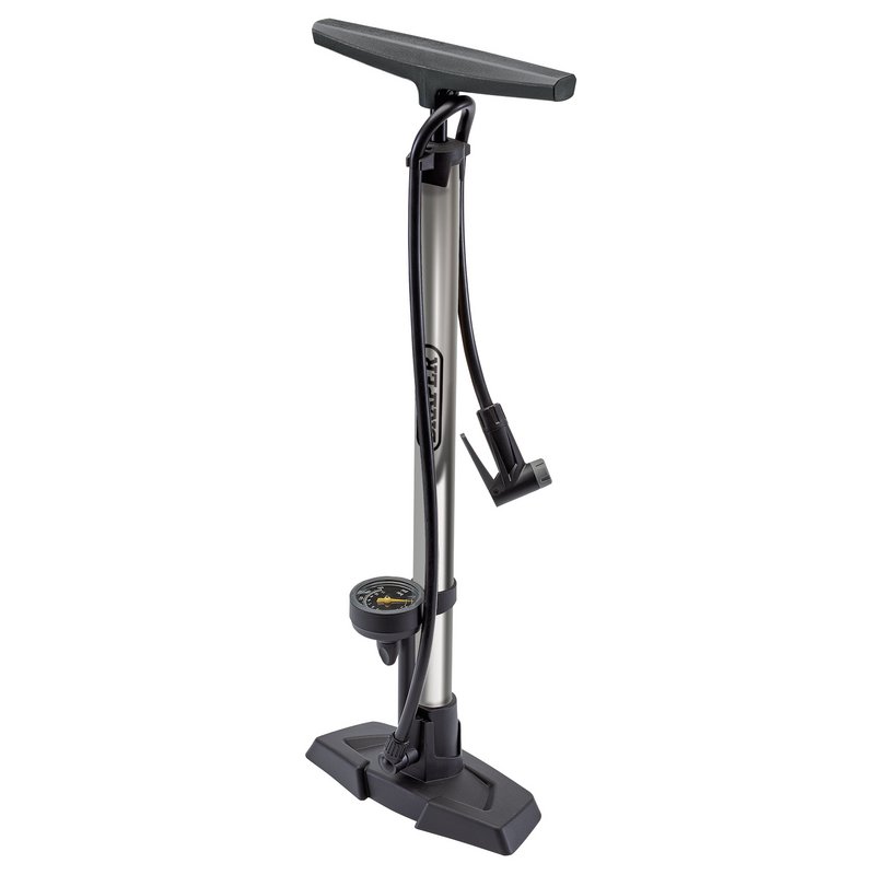 Durable steel track pump with a clever auto-fit dual connector head designed to fit both Schrader and Presta valves. Operate on either valve type without having to disassemble and rotate components, just push on and lock in place. Easy-to-read 50mm pressure gauge mounted in the middle of the pump. Maximum pressure 160psi. Suitable for mountain and road bikes.