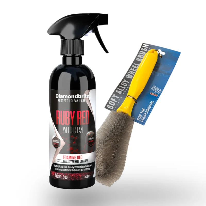 This pack includes a 500ml bottle of Ruby Red Wheel Cleaner plus an Alloy Wheel Brush. The Ruby Red neutral pH and user-friendly formulation, gives great wheel cleaning power. It can be used on both Steel and Alloy Wheels. Reacting with the Ferrous Metals contained within brake dust, it attacks those stubborn and hard to remove contaminants, releasing them in a dark red goo. Simply spray on cold wheels and leave to work for 2-3 minutes, then either work in with a wheel brush or rinse away, to leave a great finish.